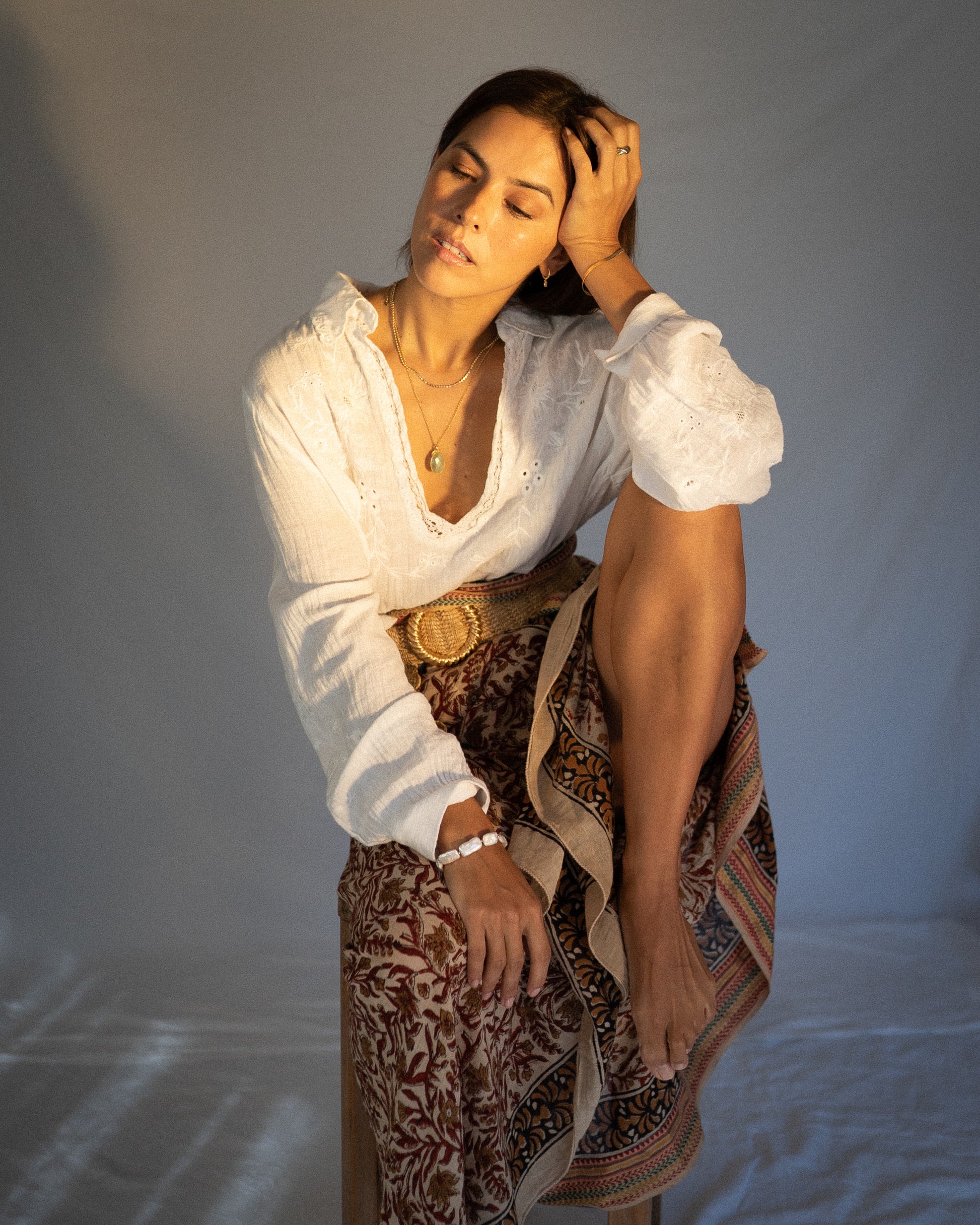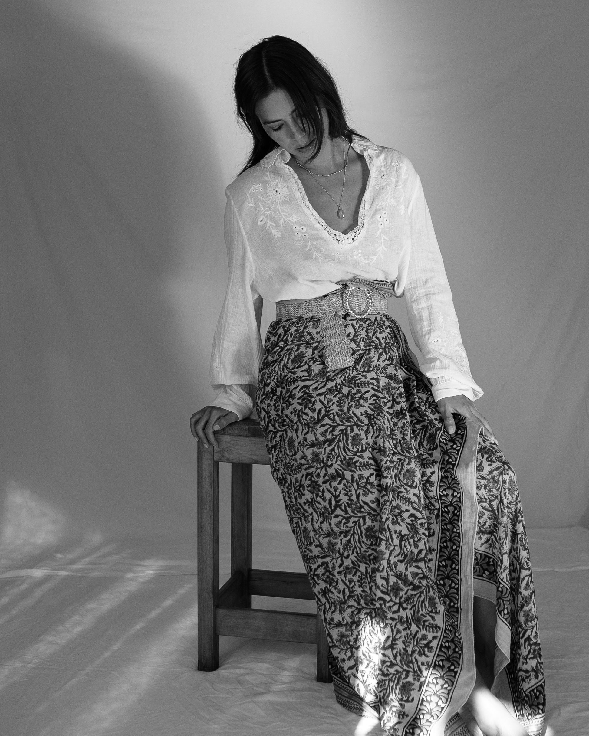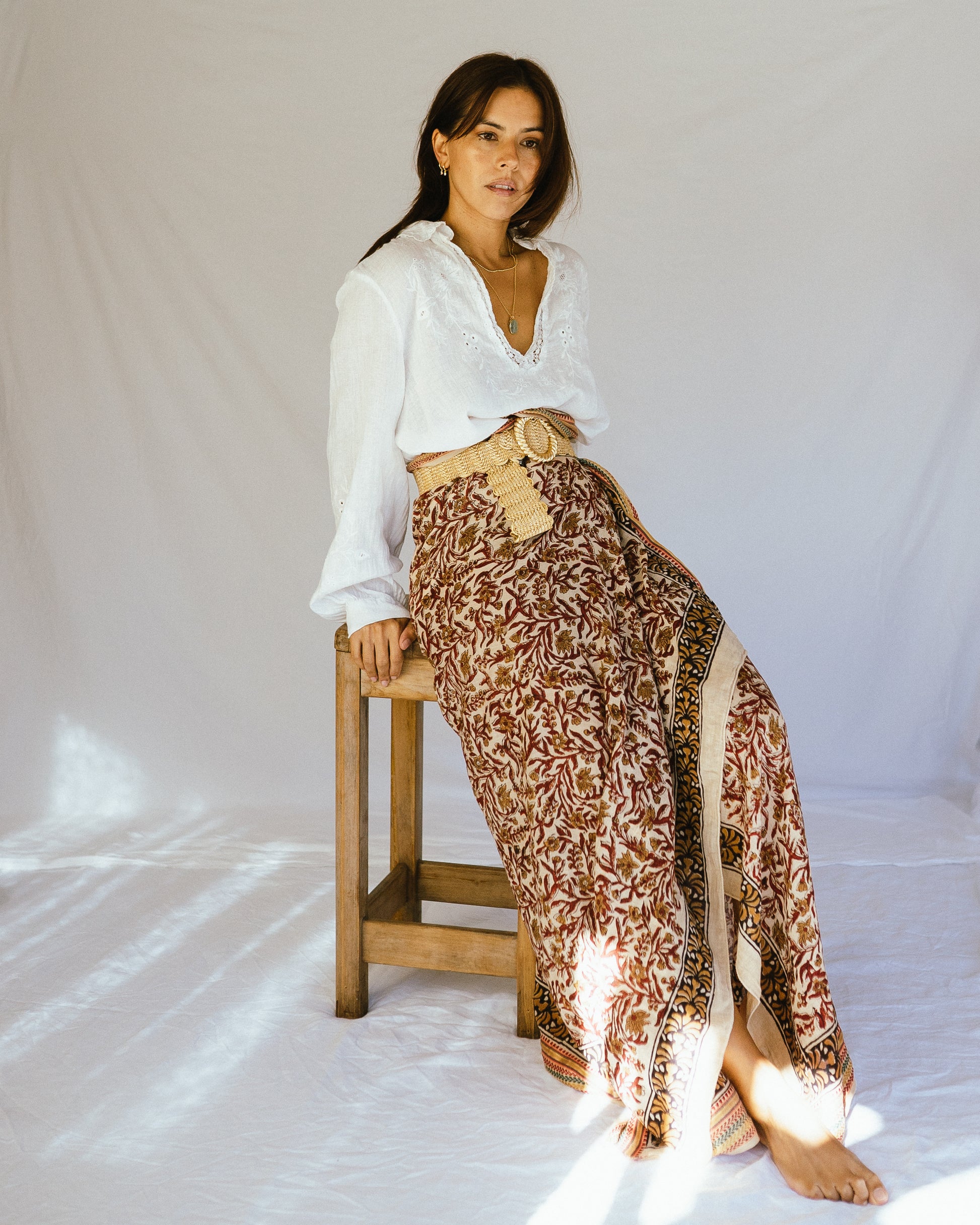 With earthy tones and a golden silk border, our Lina sarong evokes warmth, grounding, and effortless elegance.