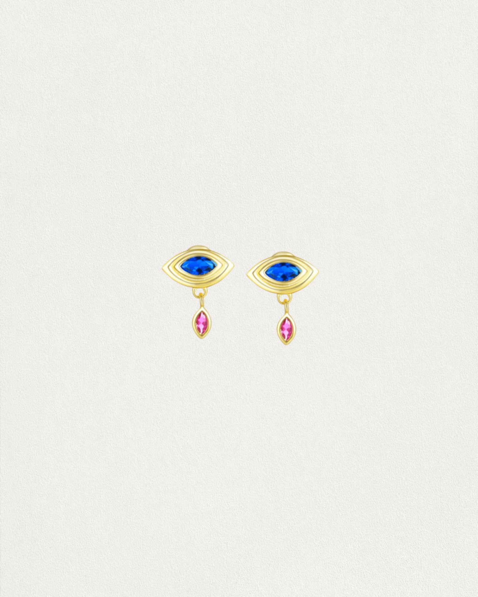 A modern talisman with an ancient soul. The Baset earrings combine a sapphire-blue resin eye with a dangling pink drop — a symbol of energy, intuition, and duality. Inspired by protective feminine figures from the ancient world, they’re a bold yet graceful expression of color and presence.