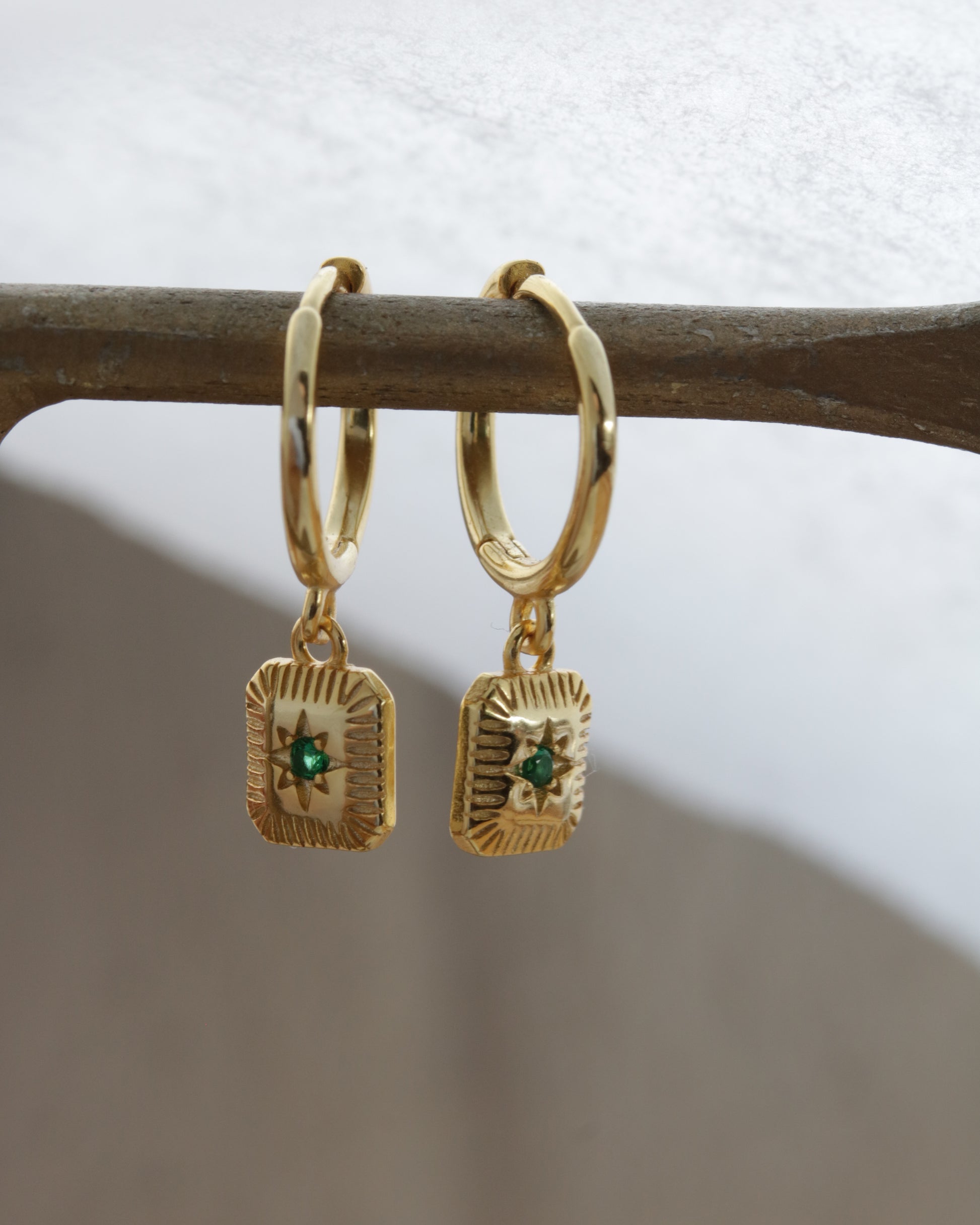 Gold-plated hoop earrings featuring small rectangular charms with a sunburst engraving and a central green gemstone. Elegant, vintage-inspired design with a polished finish.