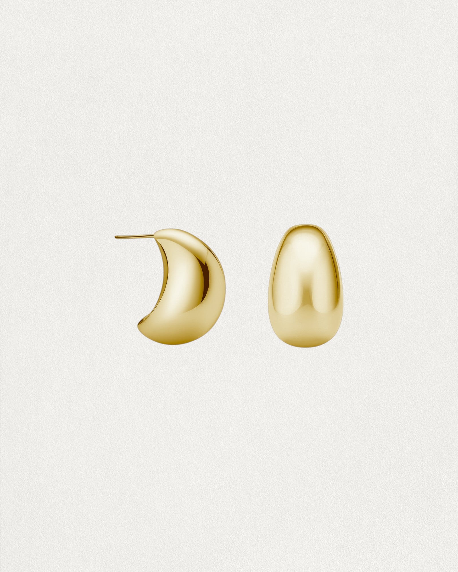 Soft curves that catch the light. The Glow earrings in gold feature a rounded crescent shape that radiates warmth and elegance. Sculptural yet lightweight, they’re the perfect touch for elevating your everyday or glowing into the night.