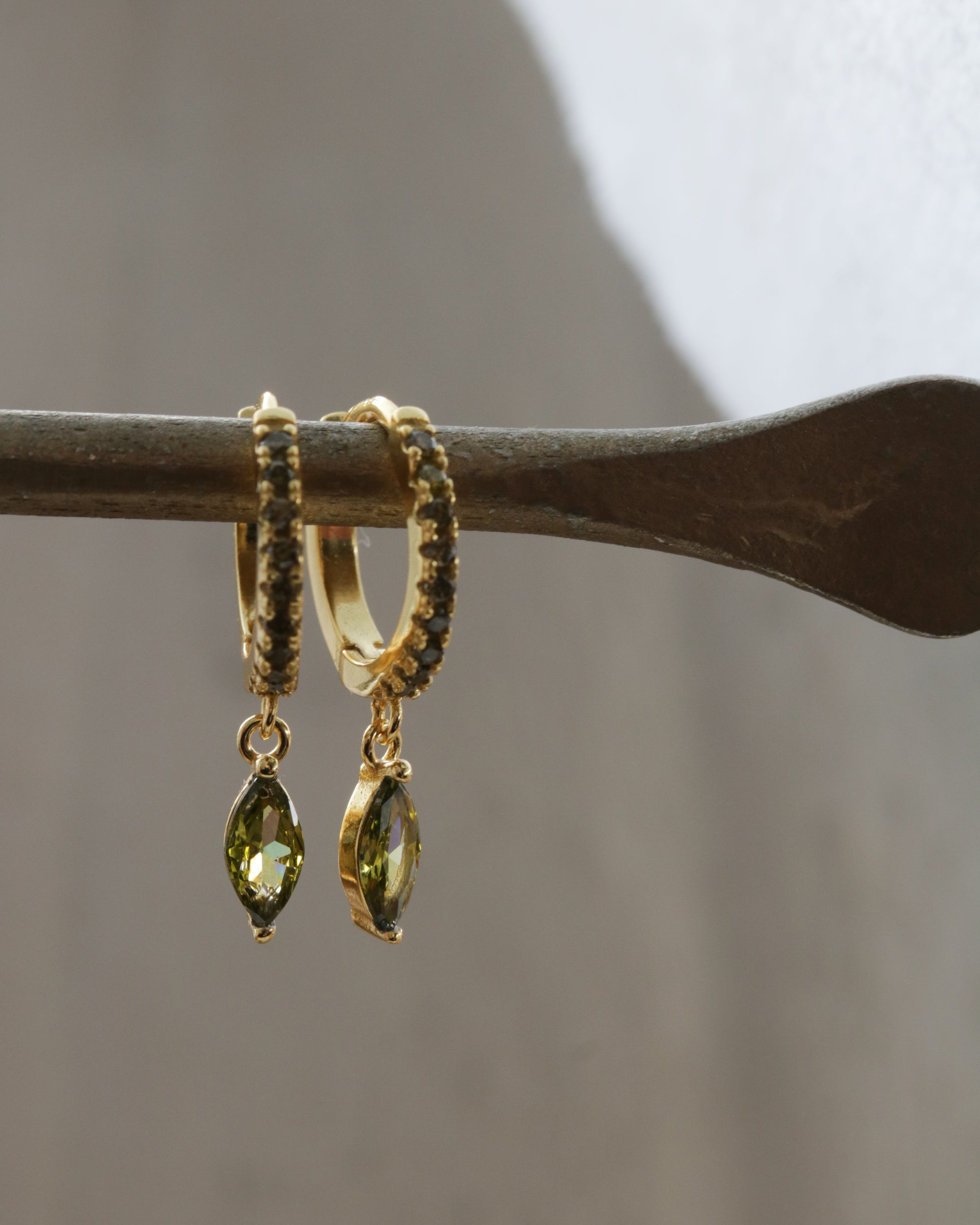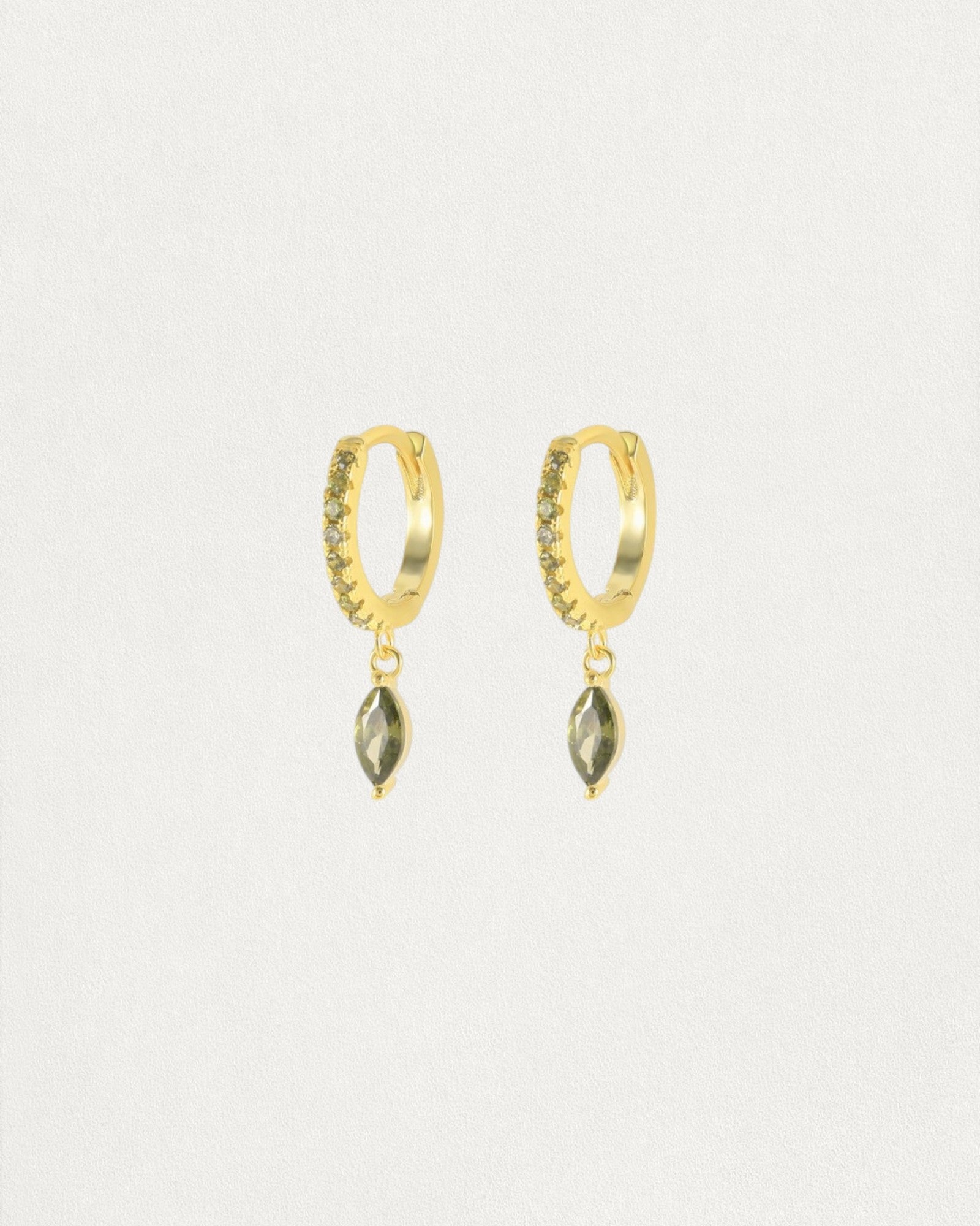 The Serene Earrings offer a delicate balance of gold and color. Featuring olive green cubic zirconia stones set into 18k gold-plated hoops, they’re finished with a soft marquise drop that moves gently with you. A subtle pop of elegance for day or night.